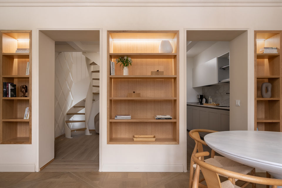 Two-level apartment consisting of kitchenette, bright living room with double sofa bed overlooked by a loft with double bed, walk-in closet, bathroom, reached by spiral staircase